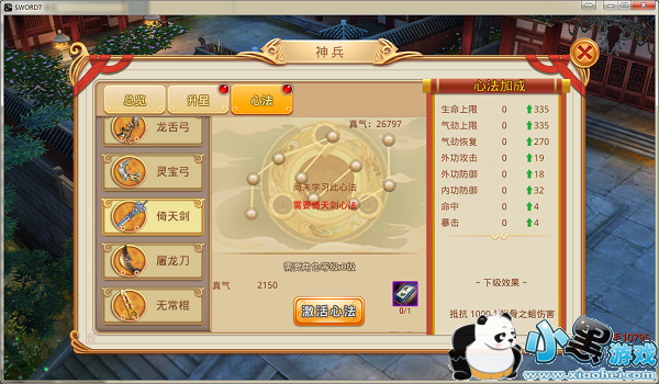 消耗真气和银两可以对神兵心法进行升级操作。心法等级提高,加成的属性也会随之提高,同时心法技能也会随之增强