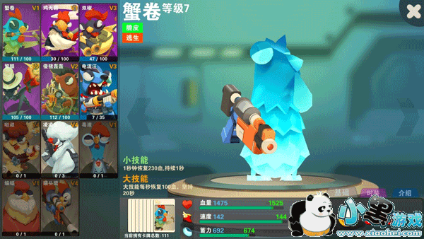 新人的第一个角色是蟹卷,是一个比较均衡的角色。移动速度较快,不易被冲脸,技能回血,有持续战斗能力。蟹卷也是我目前使用第二多的角色。蟹卷对各种枪械兼容性都较好,新手建议远中近武器各搭配一把,出生的左轮、突突和霰弹就可以。蟹卷可以说是没有什么缺点的角色,使用时无非就是上去换血,然后用技能回血,在1V1时可以使用较多远程枪械比如带三连发、突突和左轮,保持远程骚扰消耗,让对方不胜其烦,获胜几率很大。亦可使用狙击,保持距离,在对方无法有效命中的时候远程狙杀敌人,若是在使用狙击时被对手用左轮击中,建议还是马上换枪不要执着于狙击,毕竟对手如果对时机把握较好是很难狙中别人的。蟹卷同样可以用近程枪械冲脸,一边使用技能回血一边冲脸的蟹卷也可以很肉,但是要小心不要被鸡霸晕住,当猪开盾时要及时撤退。