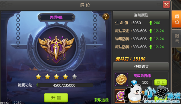 游戏前期还有两个点提升战力是很明显的,那就是坐骑和爵位,这两个系统都是前期花费少,战力提升明显,性价比很高。坐骑等级可以直接花点小钻石提升到20级以后去,坐骑阶位的话可以在龙穴宝藏里用积分兑换一些碎片来提升,直接提升到3阶是比较划算的。爵位前面可以花费钻石购买超级功勋币,爵位前期对功勋的要求低,购买一个可以升好几星,战力提升很猛,记得爵位提升后一定要佩戴爵位,佩戴后也会加一大截战力哦!