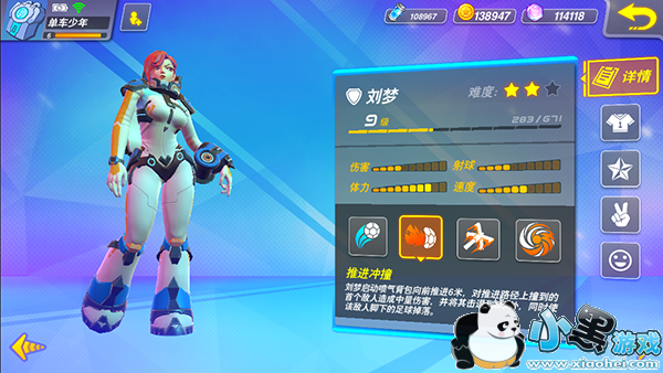 刘梦启动喷气背包向前推进6米,对推进路径上撞到的首个敌人造成中量伤害,并将其击退到8米外,同时使该敌人脚下的足球掉落。