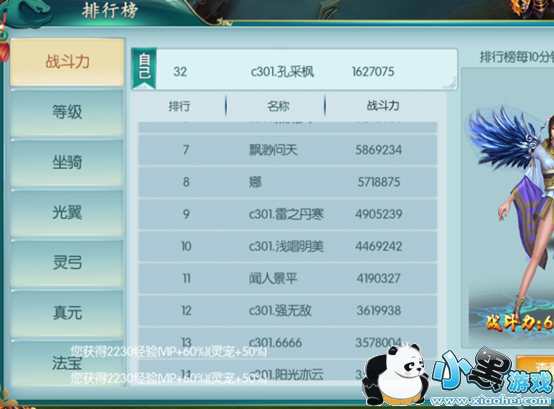 玩家达到一定等级后开放排行榜功能,排行榜分为战力榜、等级榜、坐骑榜、光翼榜、灵弓榜、真元榜、法宝榜和家族榜。