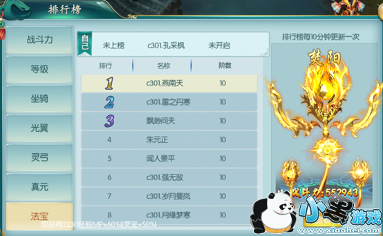 法宝榜显示全服飞升战力排行,排行第一的会获得称号“登峰造极”