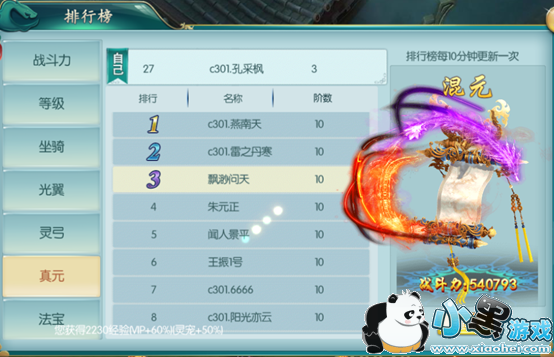 真元榜显示全服飞升战力排行,排行第一的会获得称号“摧枯拉朽”