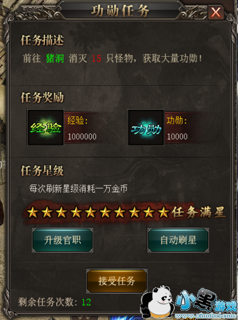 功勋任务为简单的杀怪任务,消灭指定数量的特定怪物即可轻松完成任务。任务有星级之分,星级越高奖励越多,只要花费少许金币即可刷新星级,建议玩家在接取任务之前先刷到十星任务哦!
