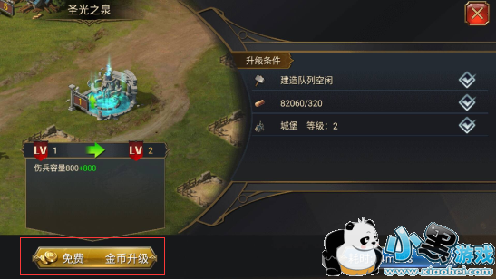 经常上线的玩家享有很大的福利,当一个建筑升级的时间少于7分钟的时候(非VIP玩家),玩家可以手动免费升级,也就是说在各位领主的建筑等级较低的时候,建筑是可以立刻提升等级,不需要等待的,各位领主可以利用这项建筑升级福利将所有农田、伐木场、训练营、圣光之泉4个建筑快速升级到3级而不需要等待时间,这里建议各位领主大人直接将这几个建筑全部升级至5级。如果各位领主大人上线比较频繁的话,利用免费加速升级可以和其他领主拉开很大的实力差距哦!