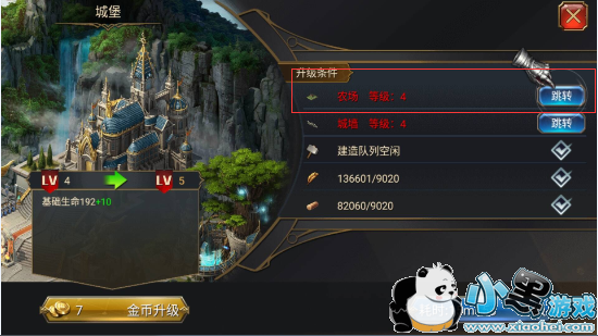 在游戏中1金币大约能降低2分钟的建造时间,在大家赶时间的时候可以使用金币直接加速建造,赢得先机!这里推荐四个兵营可以适当加速提升等级,花费少量金币提升兵营的等级,以训练更高级的兵种,兵种等级的提升对于部队战斗力的提升是巨大的。另外城堡升级需求的建筑也可以考虑使用金币或者道具快速升级,这样能加快发展的节奏,跟其他人甩开差距。