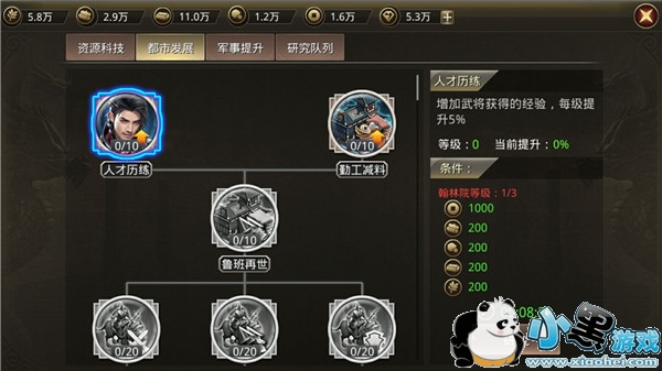 当这些基础设施都完善后,你的城池就已经开始步入发展的正轨了,中期开始我们还能建造翰林院、藏经阁等高级设施,从而研究高等级的科技来进一步提升发展速度。不过这些科技也包括资源科技、都市发展和军事提升三个方面,优先发展哪种科技,就要看你自身是喜欢韬光养晦稳定发展,还是喜欢厉兵秣马征战沙场了。