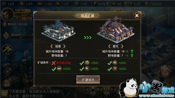 而随着城池的发展和各种设施的升级,小小的地方自然是满足不了我们作为大君王的需求。游戏内支持城池扩建,我们可以从小小的乡镇,一步步扩展到城镇,再到都市等,每次的扩建不仅能让我们建造更多的设施,更是离一统天下的目标又近了一大步。