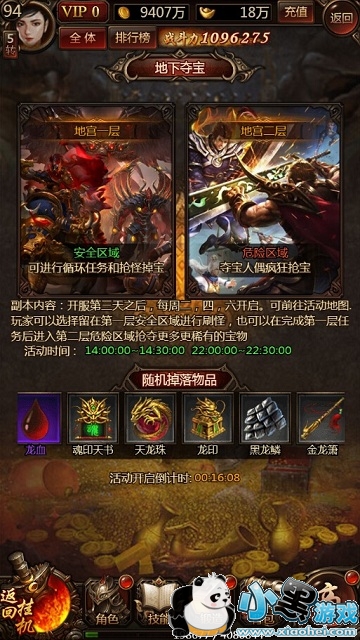 地下夺宝分为地宫一层和地宫二层两个活动地图,地宫一层是安全区域,进入该区域的玩家可以循环进行杀怪的任务。每击杀30只怪物,都可以获得龙血与元宝作为奖励。玩家之间虽然不能互相攻击,但互相抢怪的情况还是在所难免的,记得先下手为强。