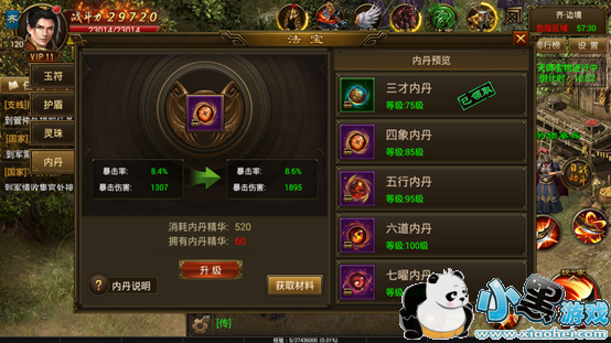 内丹增加暴击率和暴击伤害,达到需求数值即可升级。