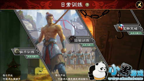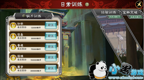 训练分为三个 “铜币训练、经验训练、宝物突破”,三个训练分别能获取的奖励想必各位主公看名字就知道了,小乔就不多介绍了~