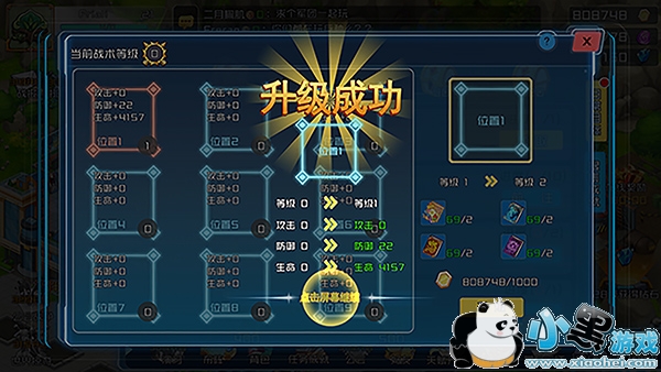 升级成功!可以看到一号位置升级后,防御和生命都有所增加!