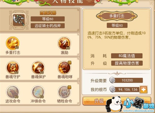 多重打击: 迅速打击3名敌方目标,分别造成100%,75%,50%的物理伤害。