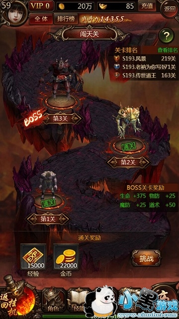游戏中有着丰富的副本玩法,其中挑战“闯天关”可以获得海量经验和材料。该玩法需要玩家不断闯关,挑战各种怪物和BOSS,每一关都会有对应奖励,还可以获得永久属性奖励,包括生命、物防、魔防、法术等属性值。