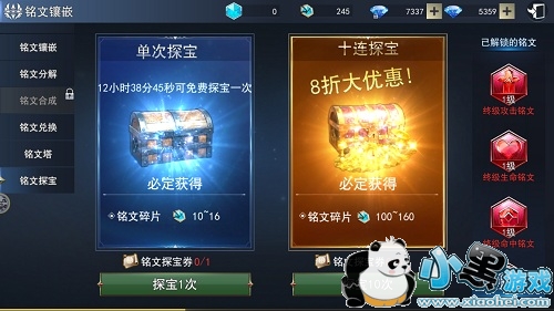5、铭文探宝:铭文探宝分为单次探宝和十连探宝,系统每18小时都会赠送一次免费的单次探宝,除去玩家的睡觉时间,平均每天都可以免费抽取一次铭文。
