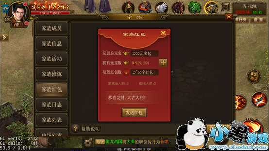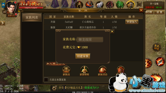 1、玩家55级开启家族功能,VIP2以上玩家可以花费1000元宝创建家族