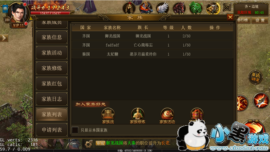 家族是《御龙战国》中玩家创建的团体组织,没有家族如何国战,加入一个实力强大的家族,结交一帮同生共死的兄弟,统一三国称霸全服!