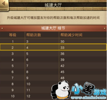 游戏中的城建大厅作为主城升级的主要前置建筑之一,是与盟友的关系纽带,在升级城建大厅后,可增加盟友对你的帮助次数和每次帮助加速的时间。