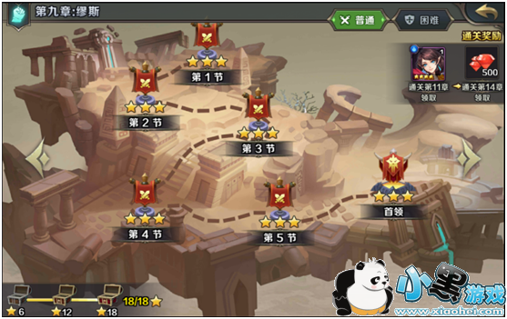 每个章节又分为普通和困难两种难度,只有当普通难度的全部关卡通过后才能挑战困难难度,两种难度的产出有所不同。普通难度挑战无次数限制,而困难难度每天仅限3次,可通过钻石购买一定次数。