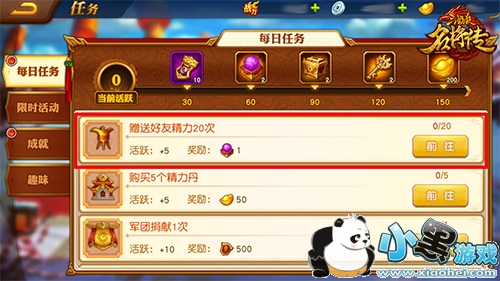日常任务赠送好友精力20次、游历20次以及60点活跃度的奖励都是精力丹,获得没有难度。