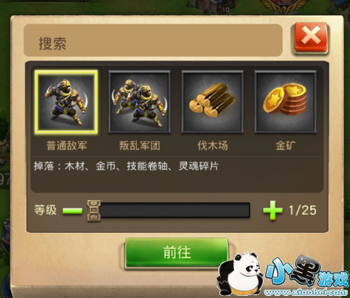 主要获得方式是通过讨伐普通敌军,叛乱军团和采集伐木场和金矿,在世界地图中,可以点击搜索来寻找你所需要攻打的敌军和占领的矿产。如下图:
