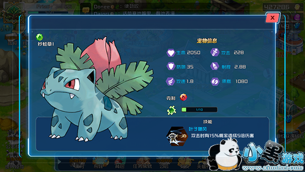 伙伴灵妙蛙草的技能为叶子飓风,攻击时有15%概率造成5倍伤害。