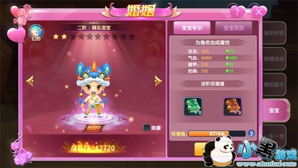 结婚后开放宝宝系统,宝宝可用宝宝启蒙书培养,培养到一定的祝福值可升星,每升满十星可以升阶。击杀首领还有几率掉落资质材料,可用于提升宝宝资质。