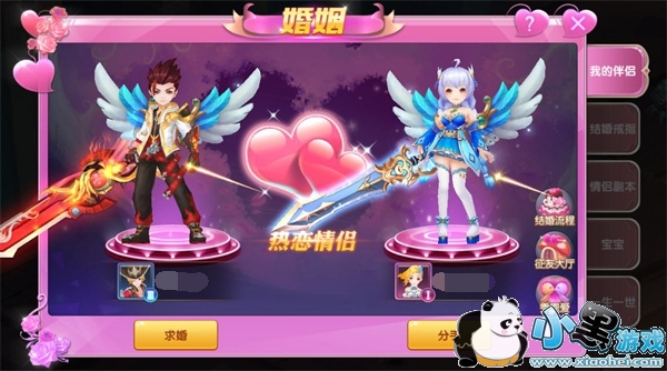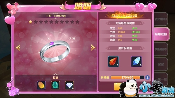 结婚后会激活戒指,使用爱情结晶对戒指进行升星,为角色加成属性,通关情侣副本可获得爱情结晶。