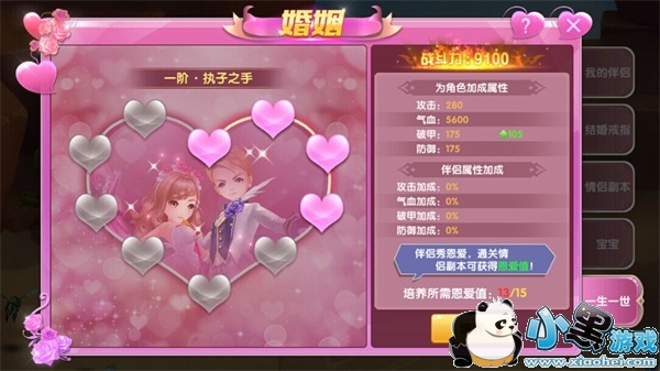 通关情侣副本会获得恩爱值,恩爱值用于培养一生一世。每次培养可填满一颗爱心,每颗爱心被填满时会加成一个属性,当所有爱心填满时,可进行升阶,升阶为角色所有属性提供加成。
