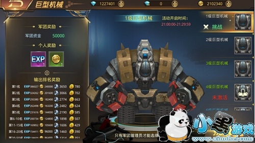 巨型机械。在活动未开始前,军团管理员可以选择已激活的巨型机械做为本次对象,军团堡垒等级越高,可选择的挑战对象越多。活动开始后,会在军团指定场景中刷出怪物,所有的军团成员均可参加挑战,在活动结束之后将会根据输出伤害排名分配奖励,奖励会已邮件的形式下发,如果击杀怪物,还会为军团增加军团资金等物资。