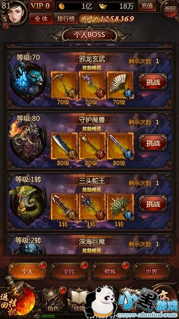 《传奇世界正版H5》挑战个人BOSS的主要奖励是装备,各个等级的个人BOSS会掉落对应等级的装备,如果运气好的话还有机会爆出橙装。每个等级的个人BOSS每天只能挑战一次,玩家们可别错过了哦。