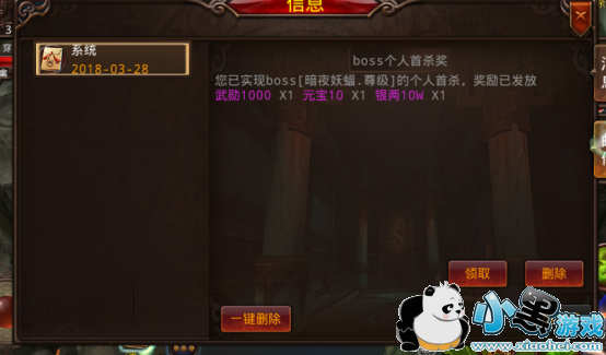 击杀第一个boss后,领取首杀奖励,奖励游戏币兑换卷,兑换后,学习技能并修炼提升属性,及时提升属性才能打得过后面的boss