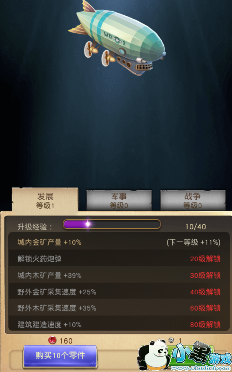 升级:与其他建筑不同的是飞艇升级需要的不是木材和金币,而是工业齿轮(零件)。此物品的产出除了元宝购买以外,就是掠夺古战场,掠夺奖励越高,副本难度越大,每天有10次掠夺机会,但是需要注意的是:不管掠夺是否成功,都需要扣除一次机会,所以勇士们在掠夺的时候一定要量力而行哦。飞艇的等级越高,可解锁的属性加成也就越高,属性加成主要分为发展、军事和战争。军事属性加成解锁需要达到的条件是:主城16级而且飞艇发展分类达到70级解锁。战争属性加成的话是要主城达到19级,飞艇军事分类达到70级解锁。