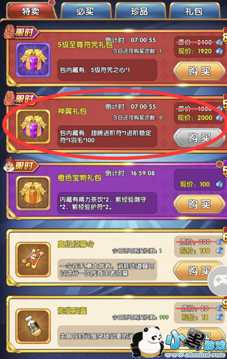 2、折扣。每当你的翅膀进阶的时候,在商城的特卖中就有会有一个神翼的礼包。不同级别的神翼礼包的物品也是不同的。这里的价格跟材料肯定是有折扣的,但是如果不是要冲排名的话,其实这个不是很推荐购买,毕竟价格其实是蛮高的。但是对排名有想法的一定要入手,不然会损失很多。