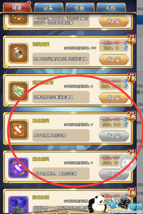 5、特卖。在这里每天有会限量的翅膀进阶符、金色羽灵、紫色羽灵。这些羽灵是可以合成更高品质的,当时不是直接合成,而且是合羽毛箱,有几率开出高级的羽灵。比如绿色的羽毛箱看出蓝色的羽灵,然后蓝色的羽毛箱看出紫色的羽灵。紫色的羽毛箱可以开出30个羽毛,金色的是60个羽毛,当然也有几率开出翅膀进阶符还有进阶稳定符。