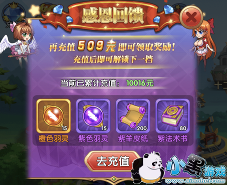 4、感恩回馈。这其实是个隐形的充值福利,在活动中是看不懂的,但是每当你达到一定消费的金额就会送一些翅膀的材料。这可能就是人家翅膀很高,你完全追不上又不明白的地方了,毕竟消费高,其实有福利拿。你不到这个阶段是看不到的。