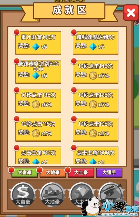 成就系统分为四类,分别为:大富豪、大地豪、大土豪、大猎手