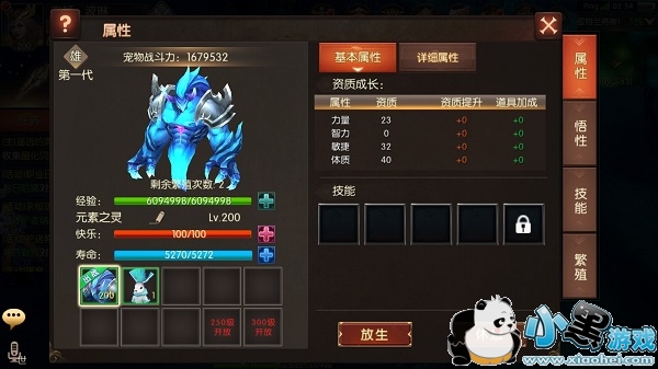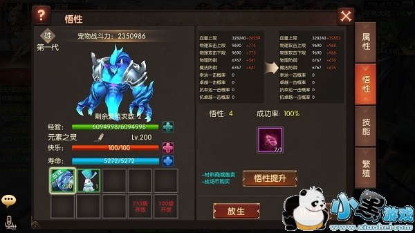 宠物通过服用经验药水进行升级,升级后获得属性成长,每级成长值与该宠物品质相关。