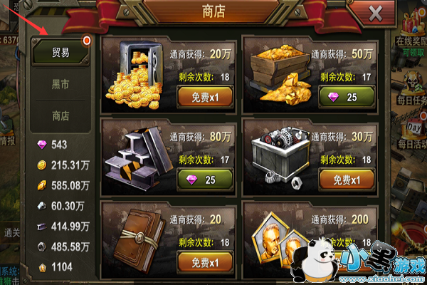 贸易:贸易系统出售五种资源和一种道具,包括金币(20万),钢铁(80万),有色金属(50万),精密部件(30万),将魂(200)五种资源,和战争笔记(20个)这种道具。一共六项,每天为所有玩家提供一次免费获得的机会,相当于是全资源的福利,使用了免费获得机会后,还可使用钻石购买。