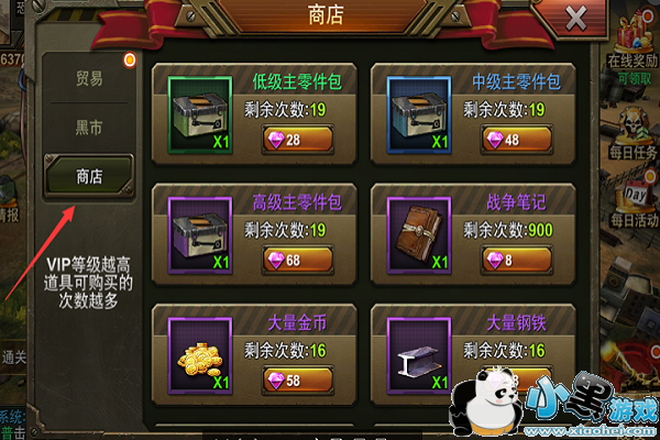 商店,就是普通的商店,商店内出售各类道具,可以让玩家快速获得所需物品。为玩家提供战争笔记,资源,三种零件包等商品,商店的优势是每种物品的可购买量比黑市更多的多,如果急缺某样资源,就把商店里买到空吧!