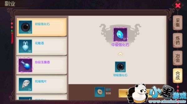 最后,在副业里我们还可以合成出各种道具,包括强化石、花雕酒、宝石等。合成没有等级要求,只要我们手上有所需的原材料,就可以进行合成了~