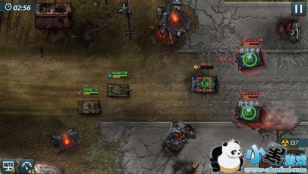 战斗中,系统提供坦克的自动行走和攻击,但用户可以手动选择优先集火攻击目标,从而更快的通关。在整个战斗过程中,重要的地方单位下部会出现黄色和红色的光圈,提示玩家选择集火攻击。