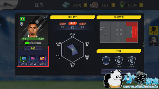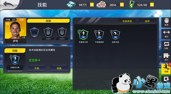 每个球员带有三个技能槽,分别在1、5、8级解锁,解锁后方可佩戴技能。我们可以为每个球员佩戴高级的技能,增加球员不同的个人能力。技能品质分为S大师,A高级,B中级,C初级。