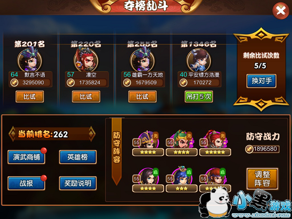 演武堂之夺榜乱斗,这是前期产出元宝的最大的地方,只要您战胜其他人,并且第一次获得该名次(例如小明刚进入游戏时排名为2513名,小李排名时为2017名,小明在夺榜乱斗中战胜小李,小明第一次达到2017名,就可以获得提升排名的元宝奖励啦~)