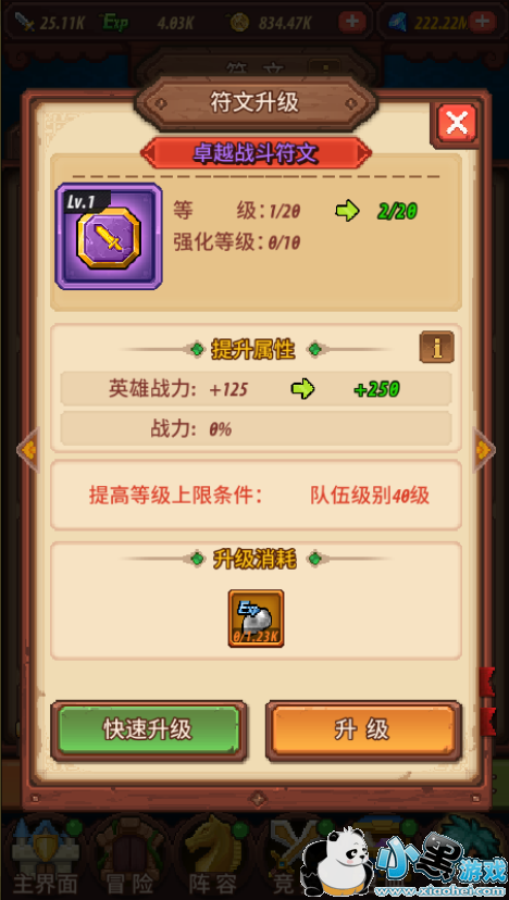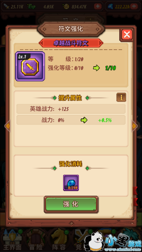 在《冒险军团》中,符文分为白、绿、蓝、紫、橙五种品质,除了白色符文,其它颜色的符文都可以进行升级和强化的操作,升级和强化分别需要消耗“符文经验”和“符文碎片”;