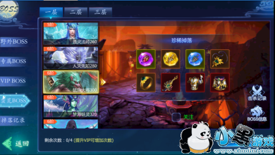 《魔天记3D》中,有很多非常丰富的BOSS资源,道友们可以尽情的享受打BOSS的快感,获得极品装备和珍贵的道具。可以点开主界面的boss按钮查看,BOSS主要分为4部分,分别是野外boss、专属boss、vip boss和蛮荒boss。