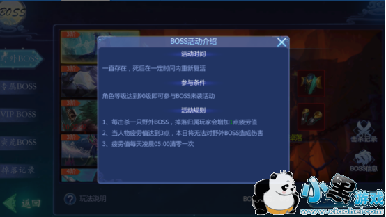 活动时间:全天活动,boss存活即可挑战,boss死后一段时间复活。VIP2以上有4次挑战次数,提升VIP可增加挑战次数。