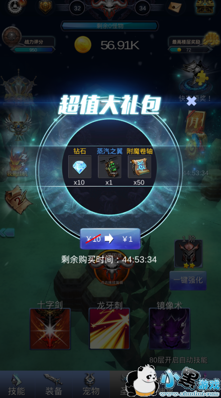 超值大礼包:1元即可获得钻石*10、蒸汽之翼*1、附魔卷轴*50 ……