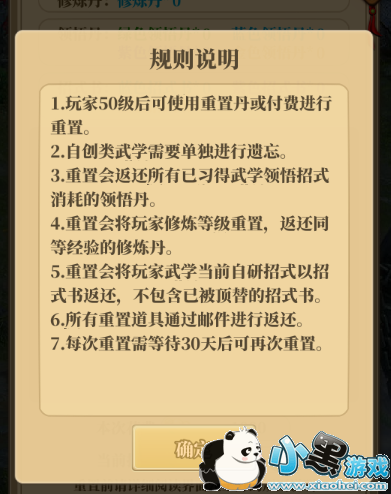 大侠们在50级后可以使用重置丹重置所学武学领悟、修炼等级及招式书,重置后大侠将获得对应消耗的领悟丹、当前的自学招式及根据等级对应的每点经验返还修炼丹返还。