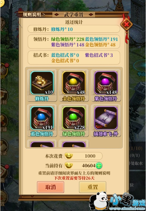 重置消耗:消耗1000元宝或使用重置丹进行重置武学。